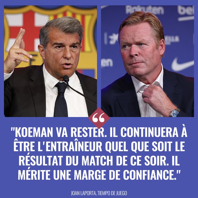 🇪🇸 #LaLiga 🚨 Joan Laporta confirme Ronald Koeman dans ses fonctions ! 😬 Qu'importe le résultat de ce soir face à l'Atlético de Madrid, le Néerlandais sera toujours le coach du FC Barcelone !