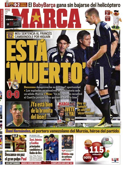« Si tu n’as pas de chien pour aller chasser mais que tu as un chat, alors tu prends le chat, non ? Parce que tu ne peux pas y aller seul. Nous avons un seul attaquant et c'est Benzema », osait le Portugais en conférence de presse, cette même année où Marca dérapait en Une de son journal : « Benzema est mort ». Mais pourquoi une telle agressivité envers un jeune attaquant arrivé l’année précédente ? Sur le plateau de la chaîne L’Equipe, le journaliste du quotidien Pablo Polo Santiais s’est expliqué. « Premièrement, on avait un patron à Marca qui était agressif, et qui n'est plus avec nous, et qui n'aimait pas du tout Karim, il faut être honnête », a-t-il avoué.