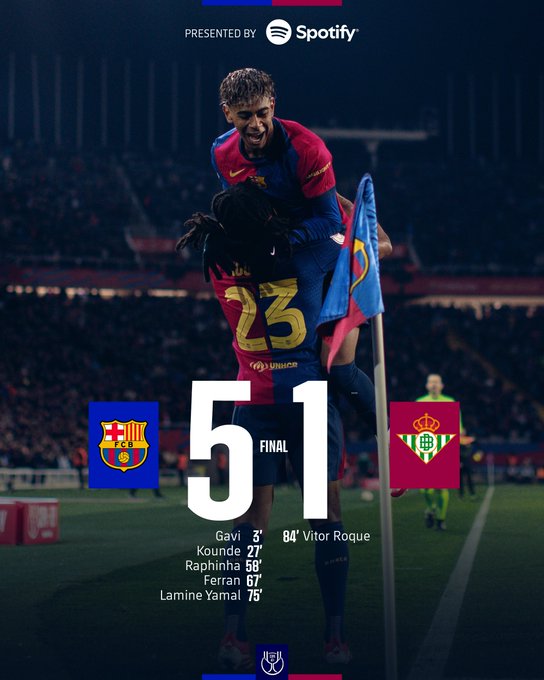 👏 C'est fini. Le Barça écrase le Betis au terme d'un nouveau festival offensif et se qualifie pour les quarts de finale de la Coupe du Roi ! #BarçaBetis