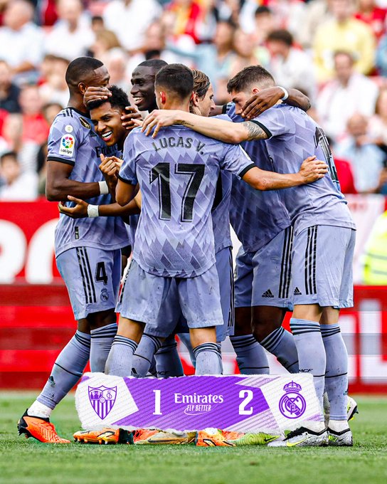 🏁 FP: @SevillaFC 1-2 @realmadrid ⚽ ⚽ Rafa Mir 3'; @RodrygoGoes 29', 69' #Emirates | #SevillaFCRealMadrid
