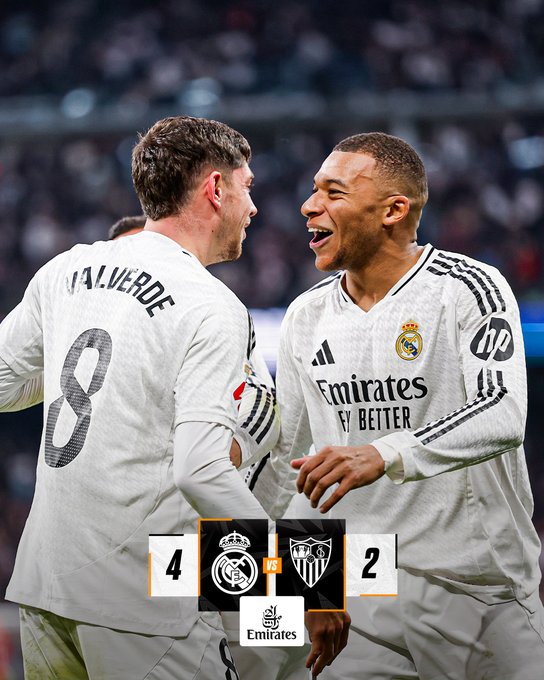 🏁 @RealMadrid 4-2 @SevillaFC ⚽ 10' @KMbappe ⚽ 20' @fedeevalverde ⚽ 34' @RodrygoGoes ⚽ 35' Isaac ⚽ 53' @Brahim ⚽ 85' Lukébakio #RealMadridSevillaFC | @Emirates
