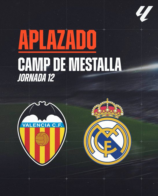 Comunicado oficial | Aplazamiento del partido ante el @realmadrid El @valenciacf ha recibido la confirmación del aplazamiento del encuentro de la Jornada 12 de @LaLiga, previsto inicialmente para este sábado 2 de noviembre, por la gravedad de la DANA que ha dejado numerosas