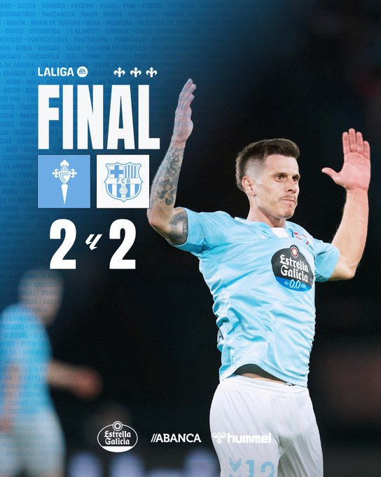 🏁 𝗙𝗜𝗡𝗔𝗟 con empate en #AbancaBalaídos 🤝 Os nosos guerreiros demostraron unha vez más o noso espírito celta 💪🩵 Grazas polo voso apoio, afección! #CeltaBarça ⋄ #LALIGAEASPORTS
