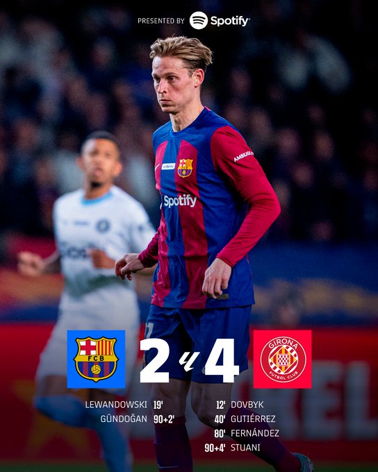 Buts : Lewandowski (19e) et Gundogan (90e+1) pour le Barça ; Dovbyk (12e), Miguel Gutierrez (40e), Valery (80e) et Stuani (90e+5) pour Gérone.