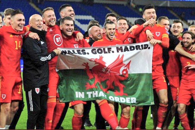 Cette moquerie a assez duré. Le #RealMadrid doit se délester de Gareth #Bale. Sans plus attendre. 📸 Hier, après la qualification galloise pour l'Euro, avec ses coéquipiers, GB affiche "Wales. Golf. Madrid. Dans cet ordre."