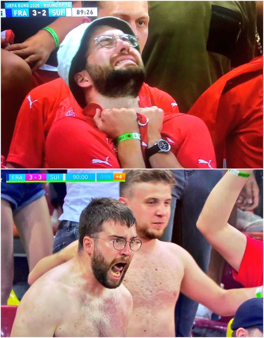 En moins de soixante secondes, Luca Loutenbach est passé de la déprime à l’euphorie totale et visiblement le réalisateur TV du match France-Suisse avait repéré le supporter de la Nati dans les tribunes du stade de Bucarest. Alors que l’arbitre venait de logiquement refuser le but égalisateur de la Suisse, sur un hors-jeu, le supporter jurassien apparaît au fond du trou et en pleine détresse, mais une minute plus tard, Luca Loutenbach est cette fois en transe et a retiré son bob et son maillot après le but du 3-3. Une séquence hallucinante et drôle, qui a rapidement été relayée des centaines de milliers de fois sur les réseaux, y compris par des personnalités telles que le maire de Londres et des footballeurs, tous sous le charme de ce supporter déchaîné. Se confiant dans le quotidien suisse