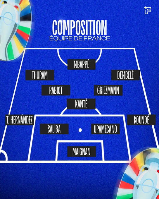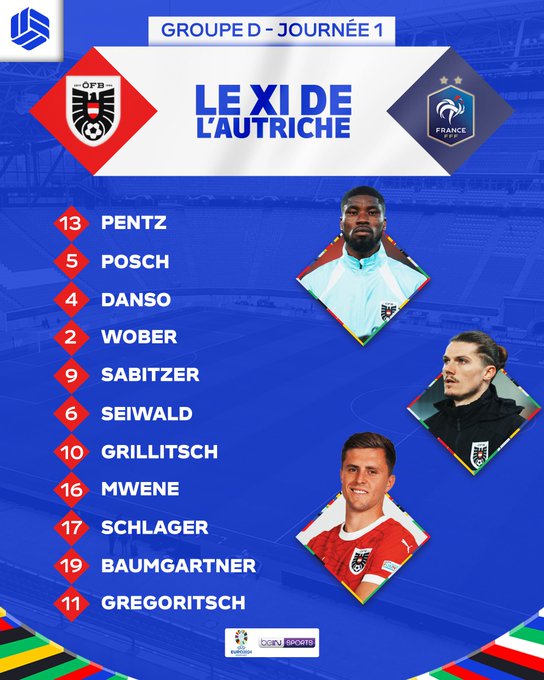 🚨 𝗢𝗙𝗙𝗜𝗖𝗜𝗘𝗟 ! 𝗟𝗔 𝗖𝗢𝗠𝗣𝗢𝗦𝗜𝗧𝗜𝗢𝗡 𝗗𝗘 𝗟'𝗔𝗨𝗧𝗥𝗜𝗖𝗛𝗘 𝗣𝗢𝗨𝗥 𝗦𝗢𝗡 𝗣𝗥𝗘𝗠𝗜𝗘𝗥 𝗠𝗔𝗧𝗖𝗛 𝗗'#EURO2024 ! 🇦🇹✅ Les Autrichiens devront faire l'exploit pour s'imposer ce soir face aux Bleus de Didier Deschamps, qui ne se laisseront sûrement pas faire. 😏