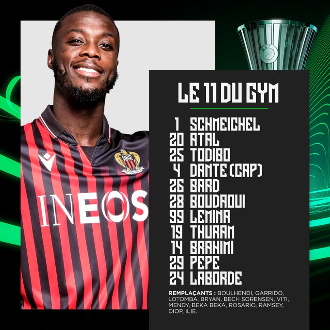 La compo de l’OGC Nice : Schmeichel - Atal, Todibo, Dante, Bard - Boudaoui, Lemina, Thuram, Brahimi - Pépé, Laborde.