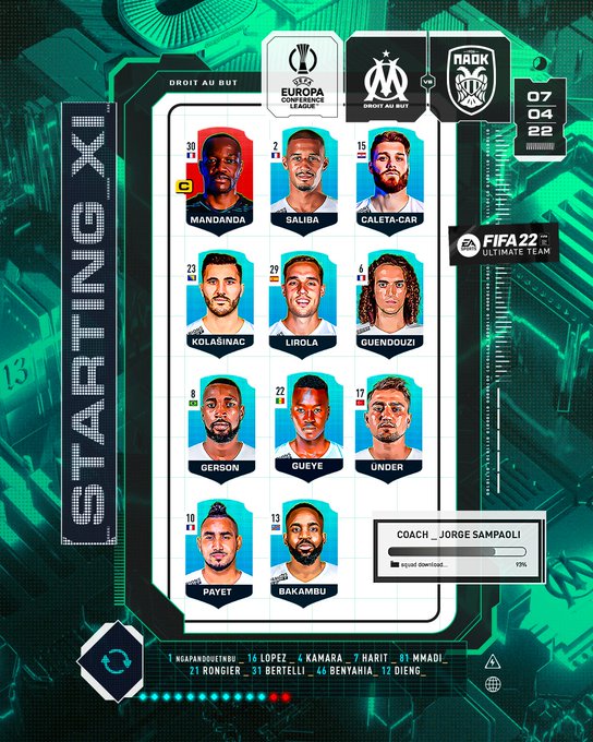La compo de l’OM : Mandanda Lirola, Saliba, Caleta-Car, Kolasinac Guendouzi, Gueye, Payet Under, Bakambu, Gerson.