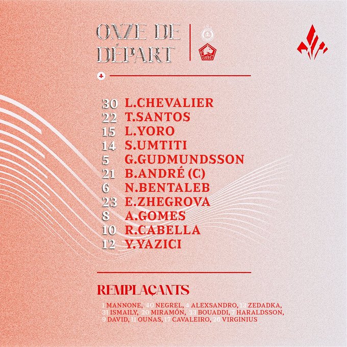 La compo du LOSC : Chevalier – Santos, Yoro, Umtiti, Gudmundsson – André, Bentaleb - Zhegrova, Angel Gomes, Cabella – Yazici.