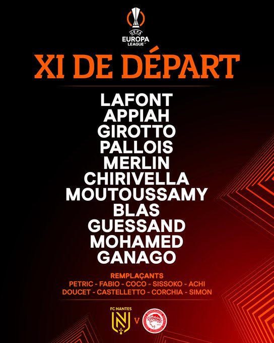 La compo du FC Nantes : Lafont - Appiah, Girotto, Pallois, Merlin - Moutoussamy, Chirivella, Blas - Guessand, Mohamed, Ganago.