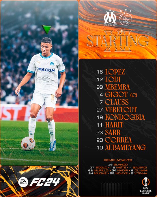 La compo de l’Olympique de Marseille : Pau Lopez – Clauss, Mbemba, Gigot, Lodi – Kondogbia, Veretout – Sarr, Harit, Correa – Aubameyang.