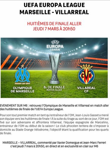 Contrairement aux autres matchs des clubs français en Coupes d’Europe, ce OM – Villarreal sera disponible en gratuit pour le grand public sachant qu’il sera diffusé sur M6, une chaîne de la TNT. Ce match de Marseille au Vélodrome sera également retransmis sur Canal+ Foot. Sur la Six, les commentaires seront assurés par Xavier Domergue et Jean-Marc Ferreri.