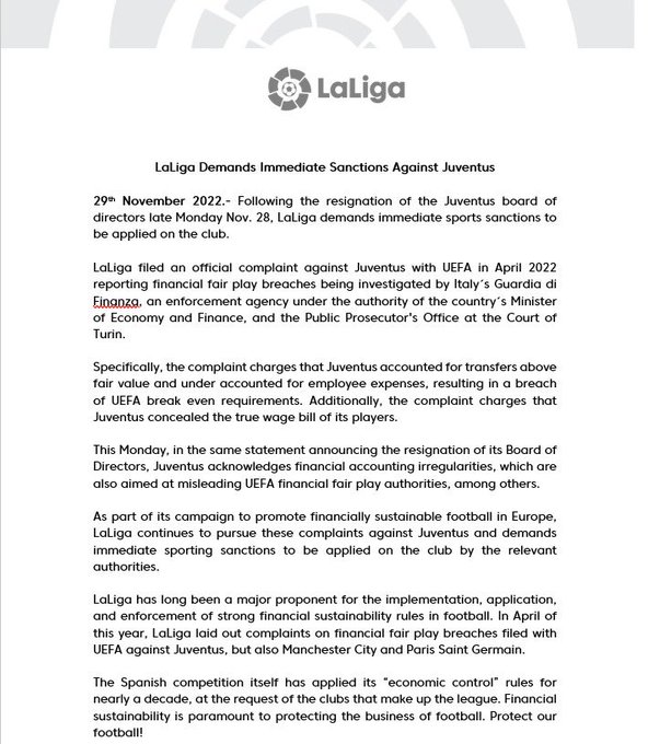 « La Liga, dans le but de promouvoir un football financièrement durable en Europe, maintient ces plaintes contre la Juventus et demande aux autorités compétentes d'appliquer des sanctions sportives immédiates au club. (...) En avril de cette année, la Liga a porté plainte pour manquement au fair-play financier auprès de l'UEFA contre la Juventus, mais aussi contre Manchester City et le Paris Saint Germain », indique t-elle notamment dans son communiqué. Comme le rappelle, le journaliste de CBS Ben Jacobs, cela signifierait une exclusion de la prochaine Ligue des champions voire une relégation en deuxième division. Des conséquences lourdes pour la Juventus mais nécessaires pour Javier Tebas, lequel n'apprécie pas non plus la Juve pour son attachement au projet de Super Ligue.