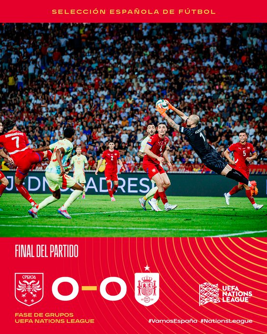 🏁 𝗧𝗘𝗥𝗠𝗜𝗡𝗔 𝗘𝗟 𝗣𝗔𝗥𝗧𝗜𝗗𝗢 𝗘𝗡 𝗦𝗘𝗥𝗕𝗜𝗔 🏟 España, que lo intentó hasta el final, suma su primer punto en el Rajko Mitić de Belgrado. 🇷🇸 🆚 🇪🇸 | 0-0 | 90+3’ #VamosEspaña | #NationsLeague