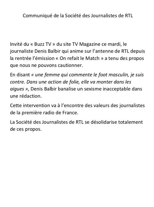 Communiqué de la Société des Journalistes de RTL suite aux propos tenus ce jour par M.Denis #Balbir.