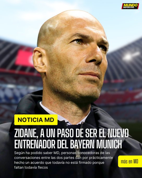 🚨 𝐙𝐈𝐃𝐀𝐍𝐄 𝐱 𝐁𝐀𝐘𝐄𝐑𝐍 🔜 Zinedine Zidane está a un paso de convertirse en el entrenador del Bayern de Múnich a partir de la próxima temporada. 🔓 Un acuerdo que todavía no está firmado porque faltan todavía flecos. El francés habría pedido refuerzos a la secretaría