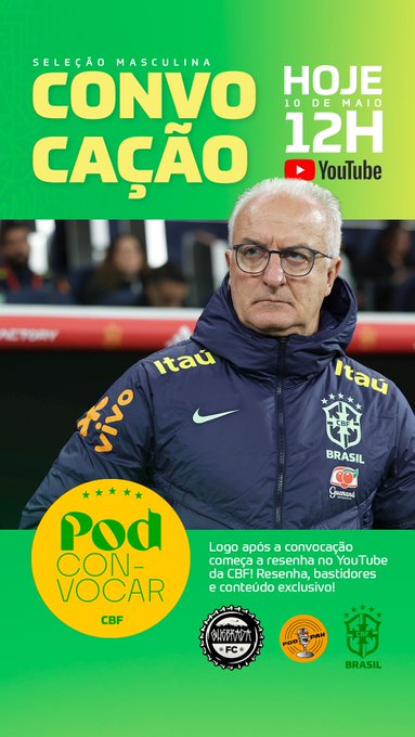 HOJE TAMBÉM TEM CONVOCAÇÃO DA SELEÇÃO MASCULINA! 📃🇧🇷 Às 12h, o treinador Dorival Jr. anuncia a convocação para os amistosos contra México e Estados Unidos e para a @copaamerica_POR! Em seguida, o técnico vai conversar com a galera do Quebrada FC, que faz parte do @Podpah, no