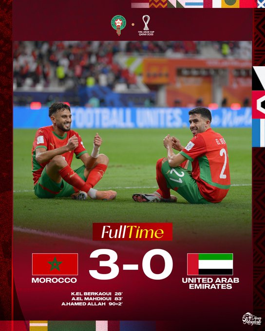 نهاية المباراة بفوز منتخبنا الوطني على الإمارات وتأهله الى نهائي كأس العرب 🏁 Full-time! 🇲🇦3-0🇦🇪 𝙅𝙤𝙗 𝘿𝙤𝙣𝙚 ✅️ 𝙏𝙤 𝙏𝙝𝙚 𝙁𝙞𝙣𝙖𝙡 🔜 #DimaMaghrib