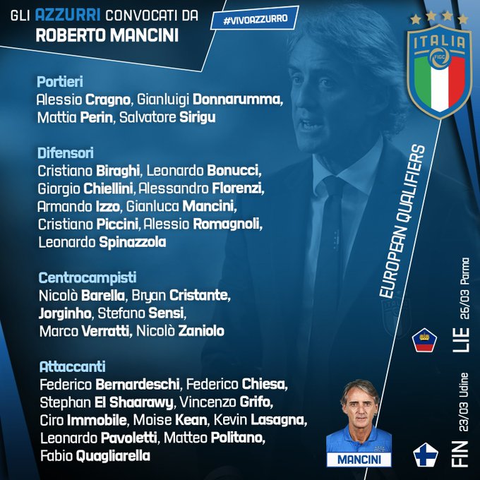 #Nazionale🇮🇹 📝Gli #Azzurri convocati dal Ct Roberto #Mancini per le gare contro #Finlandia🇫🇮 e #Liechtenstein🇱🇮 ➡️ L'articolo: bit.ly/2TMV3Pc #VivoAzzurro #Italia #EURO2020 #EuropeanQualifiers #ItaliaFinlandia #ItaliaLiechtenstein