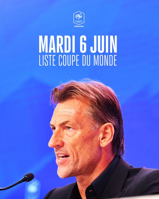 La liste des Bleues pour la Coupe du Monde sera dévoilée le 𝙢𝙖𝙧𝙙𝙞 6⃣ 𝙟𝙪𝙞𝙣 𝙖̀ 𝟭𝟲𝙝 par le sélectionneur @Herve_Renard_HR 🇫🇷 #FiersdetreBleues