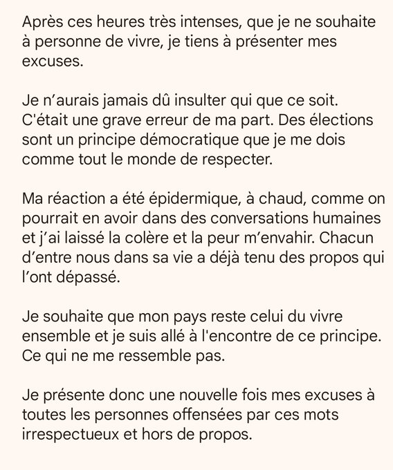 Via son compte X (anciennement Twitter), le journaliste de la chaîne sportive avoue s'être emballé de manière exagérée et le regrette. « Après ces heures très intenses, que je ne souhaite à personne de vivre, je tiens à présenter mes excuses. Je n'aurais jamais dû insulter qui que ce soit. C'était une grave erreur de ma part. Des élections sont un principe démocratique que je me dois comme tout le monde de respecter. Ma réaction a été épidermique, à chaud, comme on pourrait en avoir dans des conversations humaines et j'ai laissé la colère et la peur m'envahir. Chacun d'entre nous dans sa vie a déjà tenu des propos qui l'ont dépassé. Je souhaite que mon pays reste celui du vivre ensemble et je suis allé à l'encontre de ce principe. Ce qui ne me ressemble pas. Je présente donc une nouvelle fois mes excuses à toutes les personnes offensées par ces mots irrespectueux et hors de propos », écrit Benjamin Bernard.