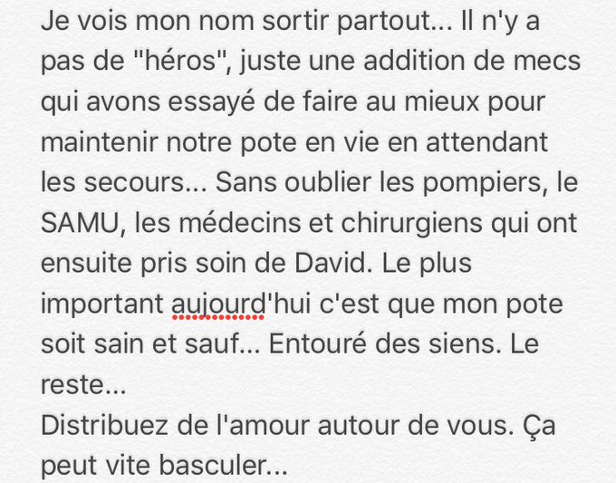 « Je vois mon nom sortir partout… il n’y a pas de « héros », juste une addition de mecs qui avons essayé de faire au mieux pour maintenir notre pote en vie en attendant les secours… sans oublier les pompiers, le SAMU, les médecins et chirurgiens qui ont ensuite pris soin de David. Le plus important aujourd’hui, c’est que mon pote soit sain et sauf… entouré des siens. Le reste… Distribuez de l’amour autour de vous. Ça peut vite basculer… », a fait savoir le chanteur, dans un message délivré à ses millions de fans sur les réseaux sociaux.