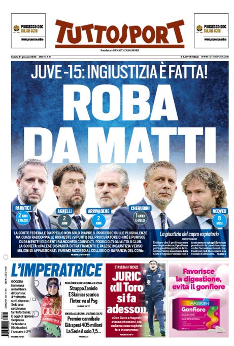 📢 ROBA DA MATTI. JUVE -15: INGIUSTIA È FATTA 📢 La prima pagina di sabato 21 gennaio, il day after di una data destinata a passare alla storia del calcio e della giustizia sportiva italiana #TuttoSport #Juventus #SerieA #plusvalenze #Agnelli #Paratici #Nedved #Cherubini