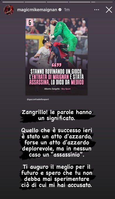 Maignan a été exclu suite à un mauvais geste et c'est Olivier Giroud qui a pris sa place dans le but. Le portier de l'équipe de France n'a pas échappé aux critiques après son comportement. Le président du Genoa, Alberto Zangrillo, l'a même qualifié de meurtrier. Néanmoins, il a quand même tenu à réagir ces dernières heures sur son compte Instagram.