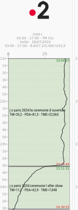 Cette courbe d’audience 😱 WoW !! 22,07 millions de téléspectateurs (soit 81,5% du public) présent devant la #ceremoniedouverture sur France 2 de #PARIS2024 Avec un très joli 86,3% sur les FRDA-50.