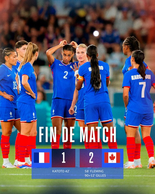 Défaite des Bleues face au Canada ce soir. Il faudra 𝗧𝗢𝗨𝗧 𝗗𝗢𝗡𝗡𝗘𝗥 mercredi prochain pour se qualifier en 1/4 de finale des JO 👊 🇫🇷1-2🇨🇦 | #FRACAN | #Paris2024