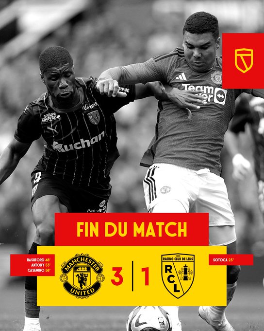 🏁 Malmené en début de seconde période par un adversaire qui a haussé le ton, le Racing a fait preuve de réaction dans les intentions sans pour autant parvenir à inverser la tendance. Désormais, place à la @Ligue1UberEats ! 👊 @ManUtd 3⃣-1⃣ @RCLens ⚽️ Sotoca (23') #MUFCRCL