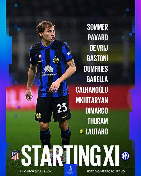 Sommer - Pavard, De Vrij, Bastoni - Dumfries, Barella, Çalhanoglu, Mkhitaryan, Dimarco - Thuram, L.Martinez
