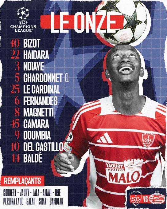 𝗦𝘂𝗽𝗽𝗼𝗿𝘁𝗲𝗿𝘀 𝗯𝗿𝗲𝘀𝘁𝗼𝗶𝘀 ! 🔴⚪ Voici le 1⃣1⃣ défini par Éric Roy pour débuter ce 6ème match de Ligue des Champions, face au PSV Eindhoven ! ⚔ #SB29PSV