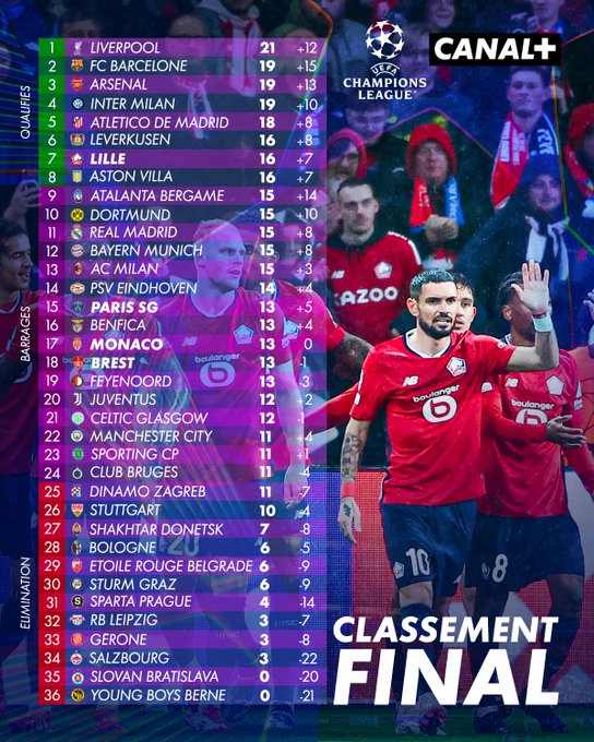 Large vainqueur de Feyenoord ce mercredi soir (6-1), Lille a atteint son objectif, celui de se qualifier directement pour les 8es de finale de la Ligue des Champions. Un véritable exploit pour les Dogues, qui terminent la phase de ligue à la 7e position. Liverpool, Barcelone, Arsenal, l’Inter Milan, l’Atlético de Madrid, le Bayer Leverkusen et Aston Villa sont les sept autres équipes directement qualifiées pour les barrages et qui n’auront donc pas besoin de passer par les barrages au contraire de l’Atalanta, Dortmund, le Real, le Bayern, l’AC Milan, le PSV, le PSG, Benfica, Monaco, Brest, Feyenoord, la Juventus, le Celtic, Manchester City, le Sporting Portugal et le Club Bruges qui passeront tous par les barrages avant d’accéder (ou pas) aux 8es de finale de la C1.