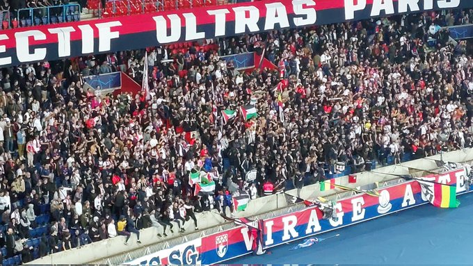 Des drapeaux palestiniens à Auteuil au moment de la composition des équipes. #PSGMAC