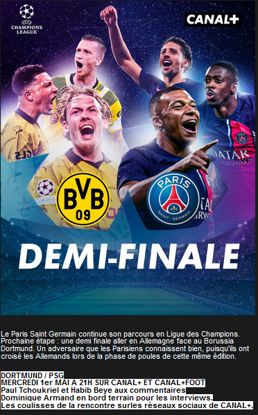 Comme tous les grands matchs européens du PSG cette saison, cette demi-finale aller de Ligue des Champions entre le BvB et Paris sera diffusée sur deux chaînes : Canal+ et RMC Sport 1. Le match sera également disponible en streaming sur l'application MyCanal, ainsi que sur l'application de RMC Sport dédiée, et réservés aussi aux abonnés.
