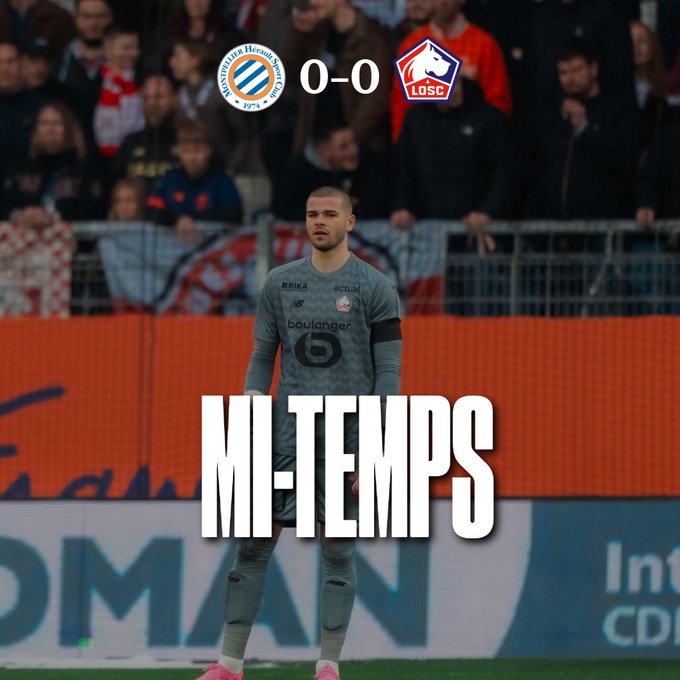 C'est la pause. Le LOSC est bousculé mais solide et rentre aux vestiaires avec un score nul et vierge. Les Dogues joueront les 45 prochaines minutes en infériorité numérique. #MHSCLOSC 0-0 | 45’