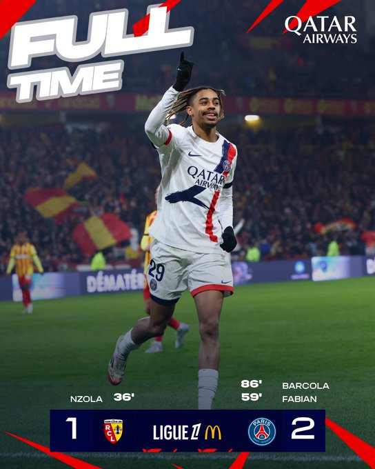 But Nzola (36e) pour Lens ; Fabian Ruiz (59e), Barcola (86e) pour le PSG