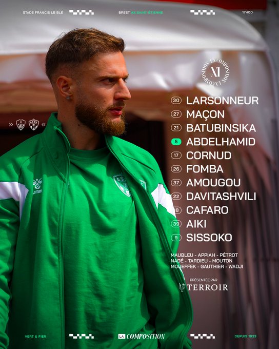 👥 Le XI stéphanois pour #SB29ASSE ! Première en Vert pour Pierre Cornud, tandis qu’Ayman Aiki intègre aussi le onze de départ ! 👊💚