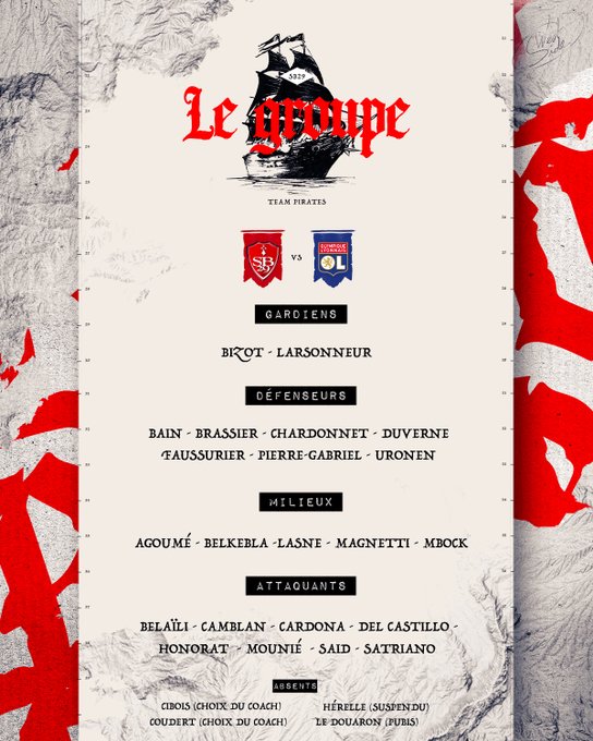 📋 Voici le 𝙜𝙧𝙤𝙪𝙥𝙚 pour le match #SB29OL ! Découvrez les 2⃣2⃣ joueurs convoqués par Michel Der Zakarian avant d'affronter l'@OL. #TeamPirates 🏴☠️ | #SB29OL