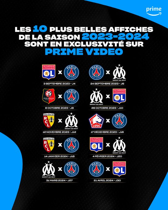 🔥 Le retour de la @Ligue1UberEats se précise sur #PrimeVideoLigue1. Retrouvez ci-dessous les dates des 🔟 plus belles affiches de la saison 2023/2024 qui seront diffusées en exclusivité sur Prime Video.