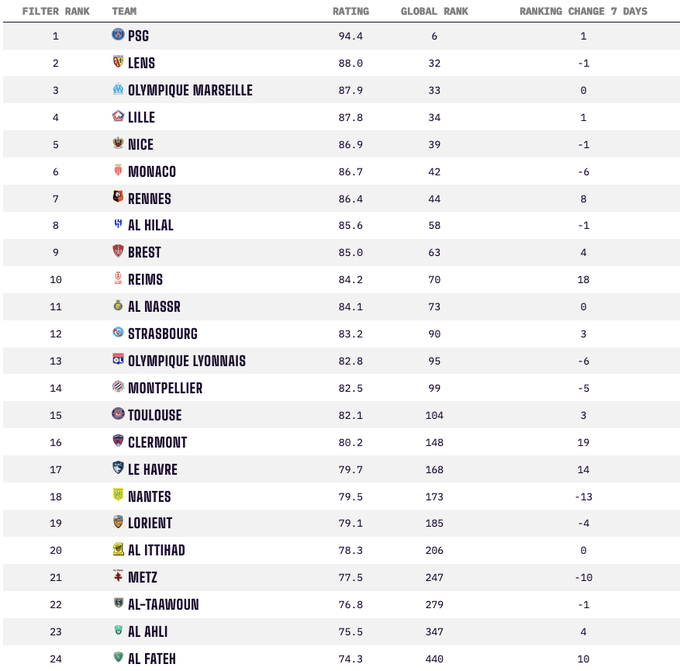 Top 24 teams from Ligue 1 and the Saudi Pro League according to the Opta Power Rankings: Just five Saudi Pro League teams appear...