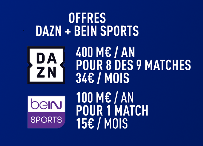 Pour les téléspectateurs, ce sera la soupe à la grimace puisqu’il faudra s’abonner à BeIN Sports et à DAZN pour suivre toutes les rencontres. A un prix total de 15 euros par mois pour la chaine qatarie, et 34 euros par mois pour DAZN, soit un total de 49 euros par mois. La pilule risque d’être difficile à avaler mais les présidents de Ligue 1 estiment que l’essentiel est sauf et ils ont fini par voter à l’unanimité pour cette solution qui a le mérite de terminer ce feuilleton.
