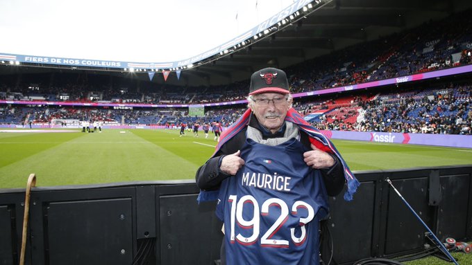 Un supporter centenaire honoré au Parc des Princes face au Stade de Reims ! 🏟️✨ Maurice Ejnes, 101 ans, a assisté à l’échauffement des joueurs en bord de terrain ce dimanche 10 mars accompagné de son fils et de sa petite-fille. ❤️💙 #PSGSDR