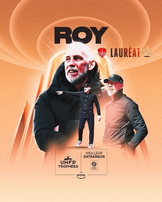 Le nouveau ℛ𝑜𝓎 de Bretagne s’appelle Eric 👑 Une saison d'exception menée d'une main de maître, qui ouvre les portes de l'Europe au Stade Brestois 29. Eric Roy remporte le Trophée UNFP de meilleur entraîneur de @Ligue1UberEats 🏆 Félicitations Eric ! 👏 #TropheesUNFP