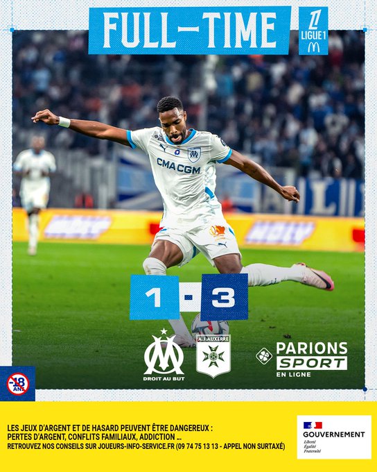 ⏱️ 90+6’ | #OMAJA 1️⃣-3️⃣ Fin du match. L'OM s'incline face à l’AJ Auxerre. 📆 Place à la trêve internationale avant le déplacement à Lens le 23/11 🌍