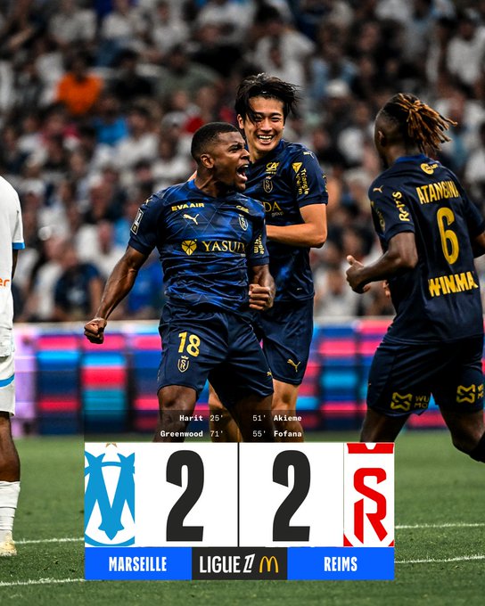 Buts : Harit (25e) et Greenwood (72e) pour l’OM ; Akieme (51e) et Yaya Fofana (55e) pour Reims.
