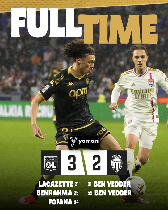 Buts : Lacazette (22e), Benrahma (26e) et Fofana (84e) pour l’OL ; Ben Yedder (1ère, 60e) pour Monaco.