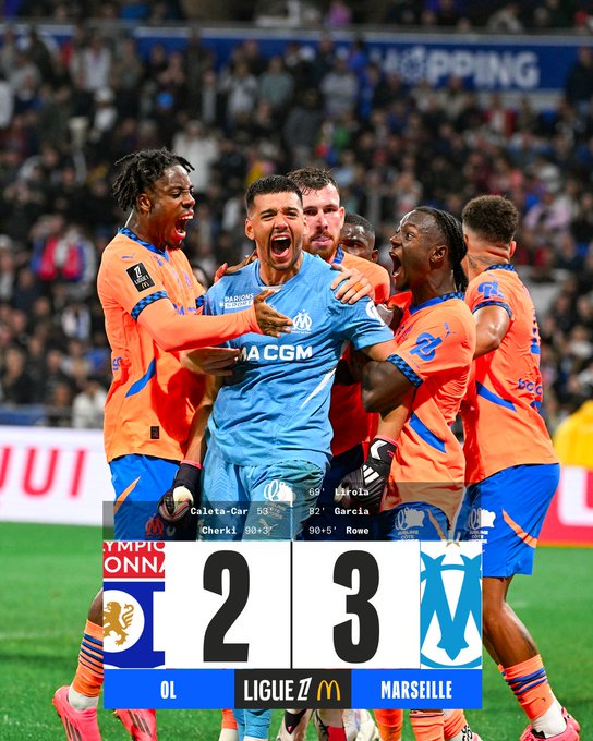 Buts : Caleta-Car (53e) et Cherki (90e+3) pour l’OL ; Lirola (69e), Garcia (82e) et Rowe (90e+5) pour l’OM.